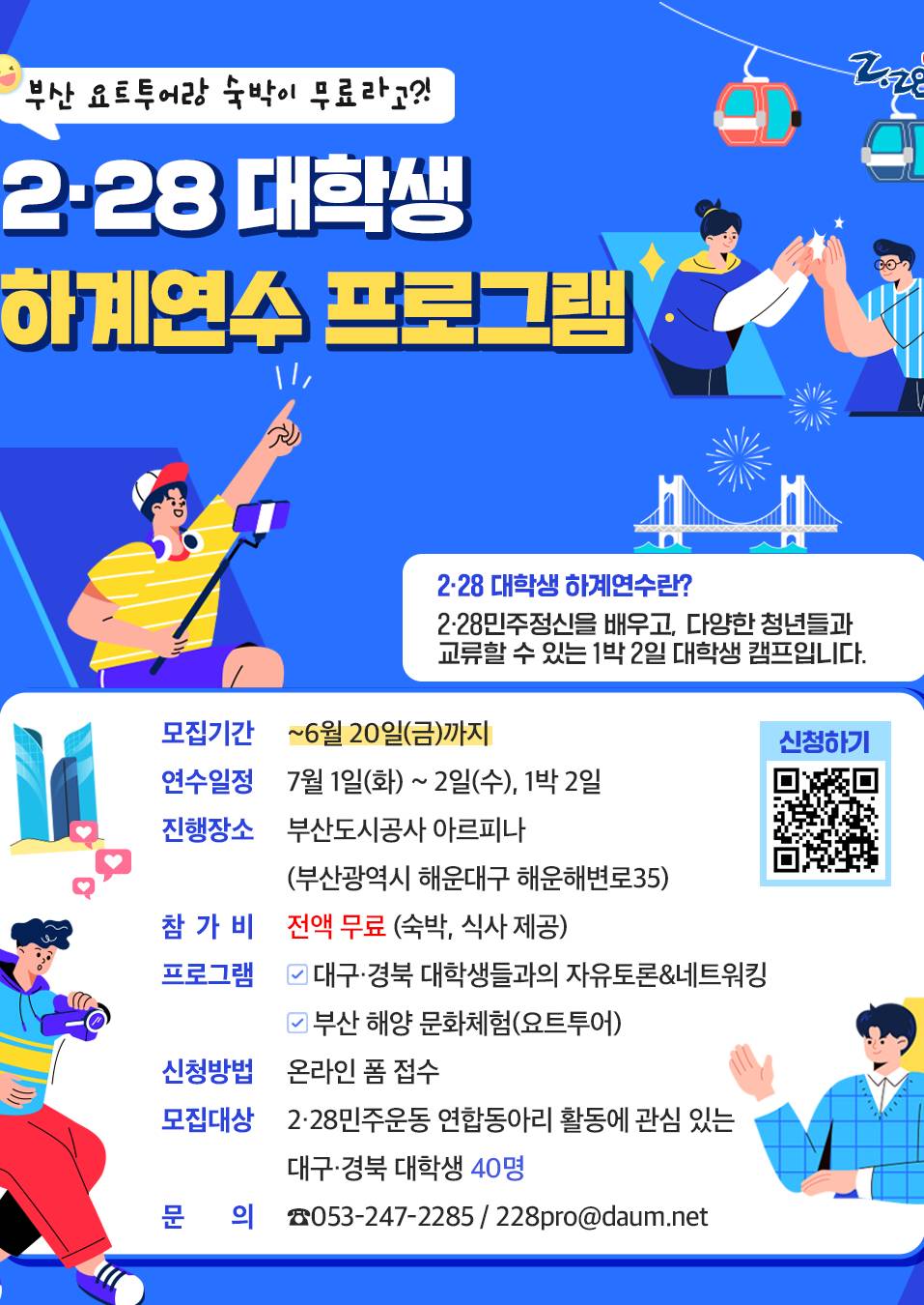 - 본 연수는 다양한 대학의 학생들이 모여 2·28민주정신에 대해 교류하고, 부산 해양 문화체험, 2·28기념사업회 회장과의 대화 등 의미 있는 프로그램을 함께 경험하는 1박 2일간의 교육연수 프로그램입니다.