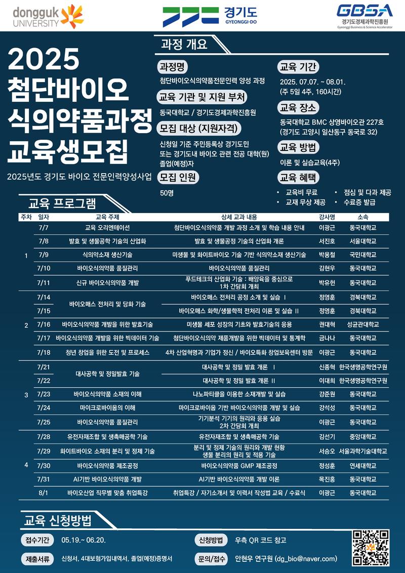 동국대학교 2025 첨단바이오식의약품 전문인력 양성과정 교육생 모집합니다.