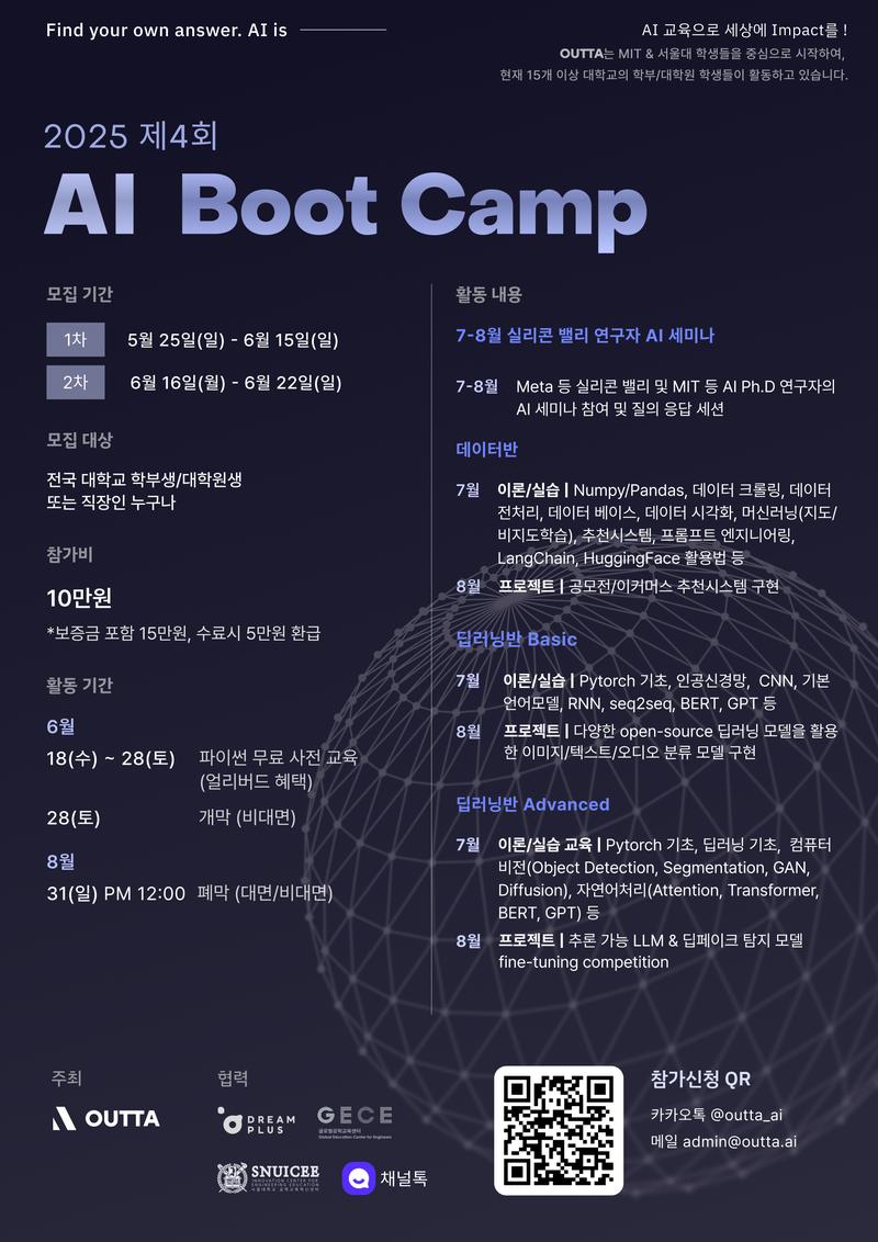 🤖 딥러닝 / 데이터사이언스 배우고 싶은 사람들을 모집합니다! 2025 제 4회 OUTTA AI 부트캠프 🙋