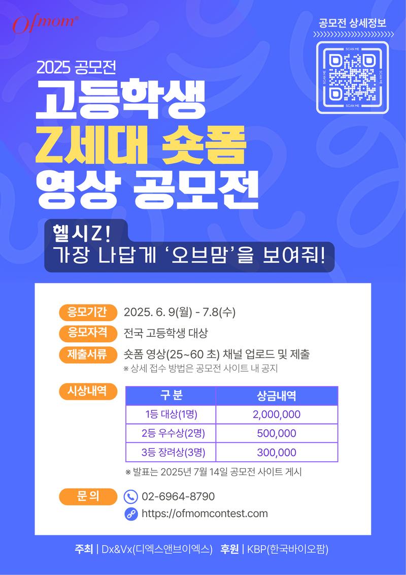 한국바이오팜에서는 청소년들의 창의적인 콘텐츠 제작 역량을 응원하고, 건강한 삶에 대한 젊은 세대의 감성을 표현할 수 있는 기회를 제공하고자 『오브맘 숏폼 영상 공모전』을 개최합니다. 틱톡, 인스타그램, 유투브 쇼츠 등 숏폼 영상에 관심 있는 고등학생들의 많은 참여를 바랍니다.