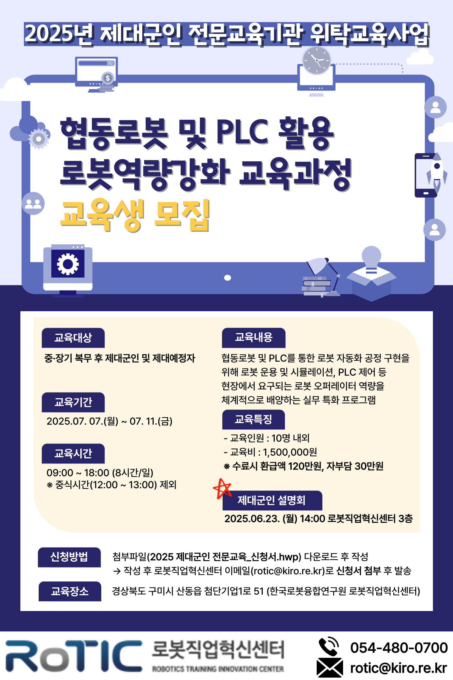 본 사업은 제대군인을 대상으로 ‘협동로봇 및 PLC 활용 로봇역량강화 교육과정’을 제공하오니 관심 있는 분들의 많은 지원 부탁드립니다.
