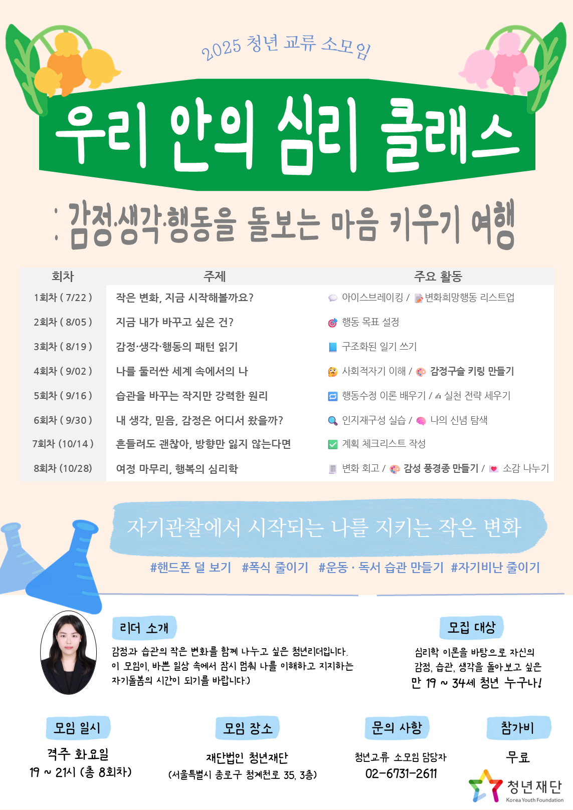 청년재단 <우리 안의 심리클래스: 감정·생각·행동을 돌보는 마음 키우기 여행> 청년교류 소모임 신청 안내
