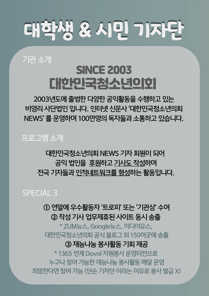 사단법인 대한민국청소년의회 / 대학생 & 시민 기자단 (~6/30)