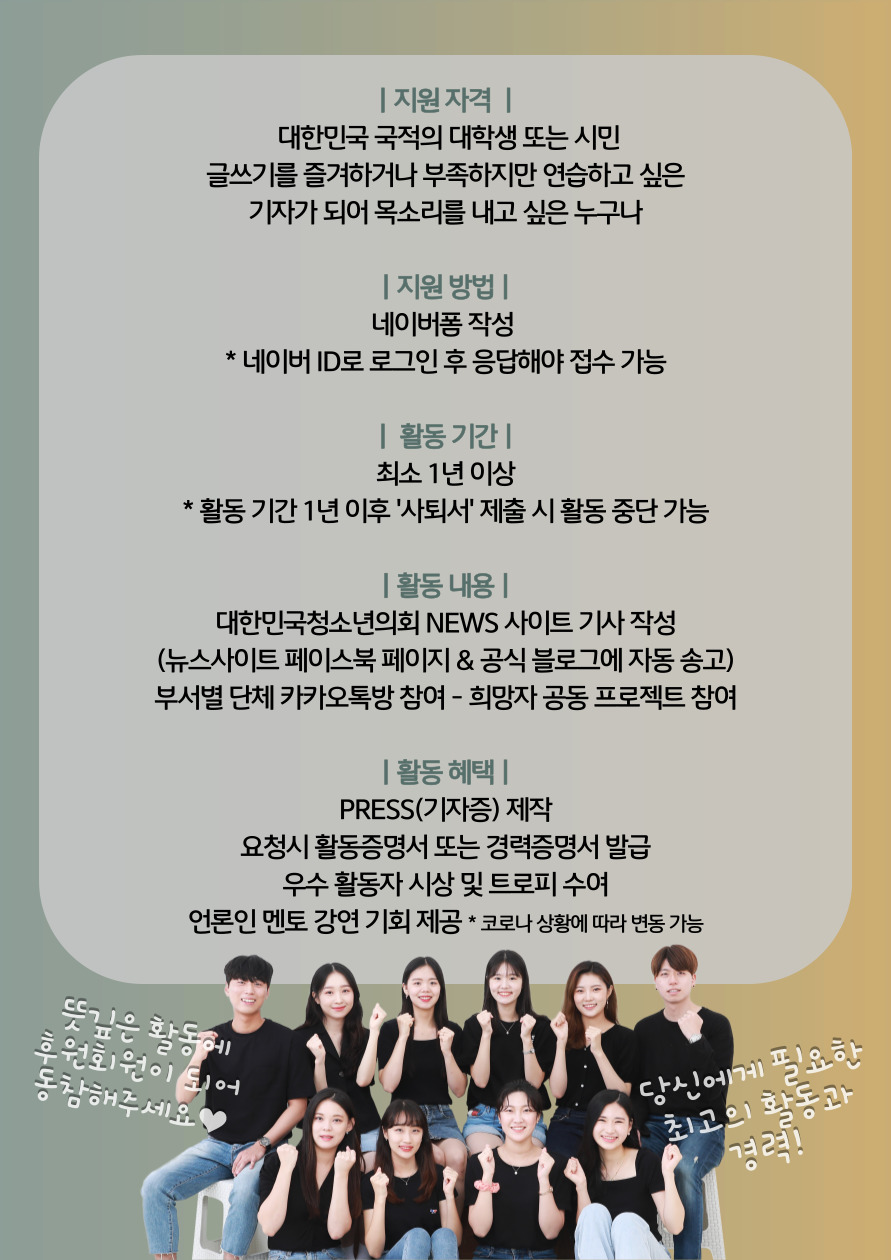 100만명이 보는 뉴스 대한민국청소년의회 NEWS의 정식 기자가 되어 활동하실 분을 모집합니다.
