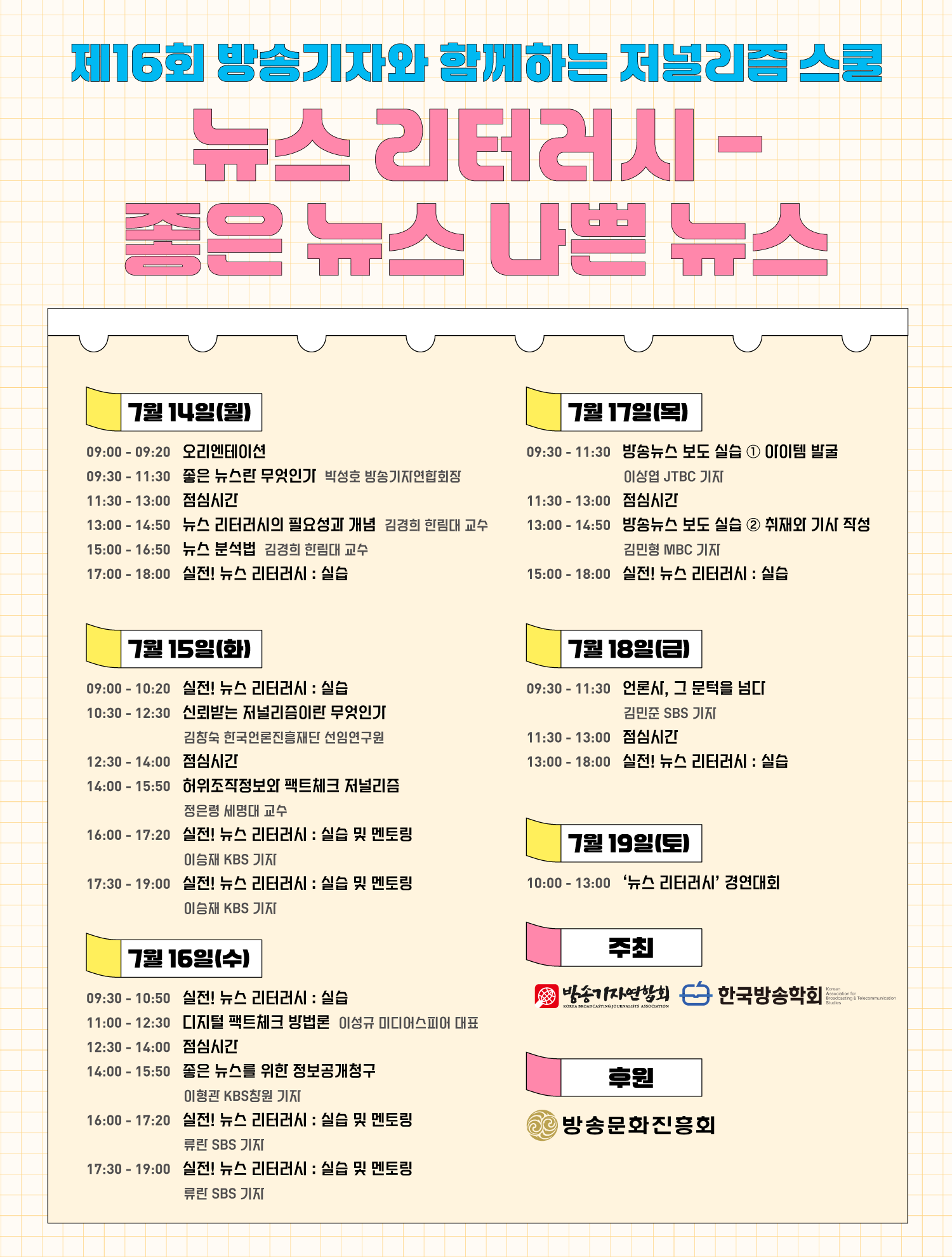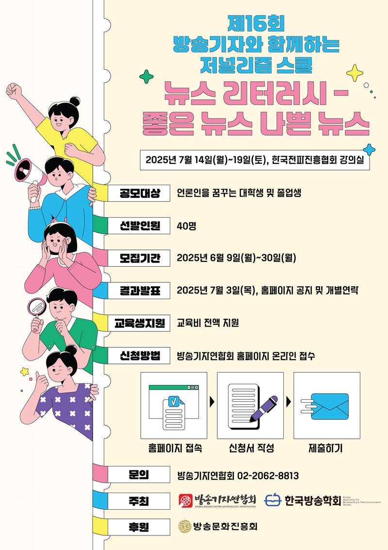 제16회 방송기자와 함께하는 저널리즘 스쿨이 다가오는 7월에 시작합니다. 올해로 16회를 맞이한 저널리즘 스쿨은 다수의 현직 기자 및 언론인을 배출했고, 언론인 지망생에게 저널리즘의 가치와 언론 현장의 실무를 전달하는 교육의 장입니다. 많은 관심 부탁드립니다.