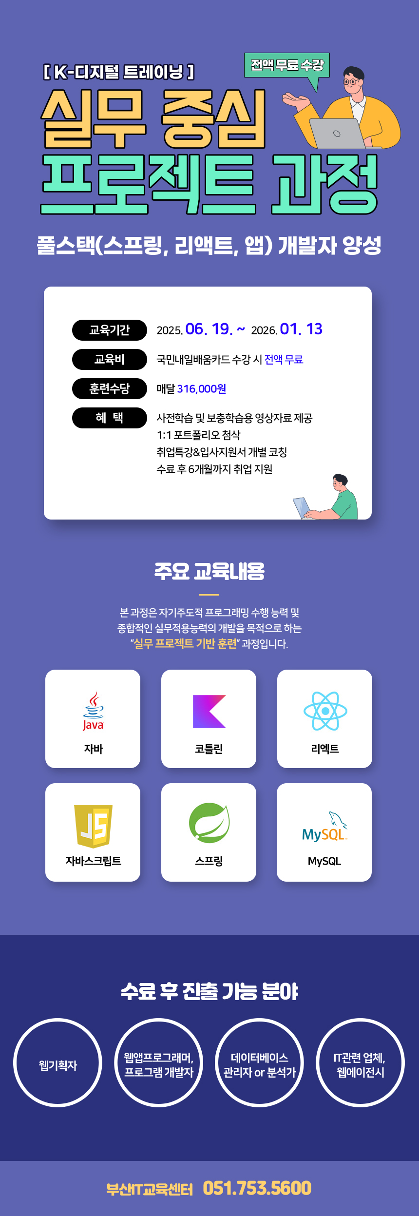 📍 과정명 : [K디지털] 실무 프로젝트 기반 풀스택(스프링, 리액트, 앱) 개발자 양성