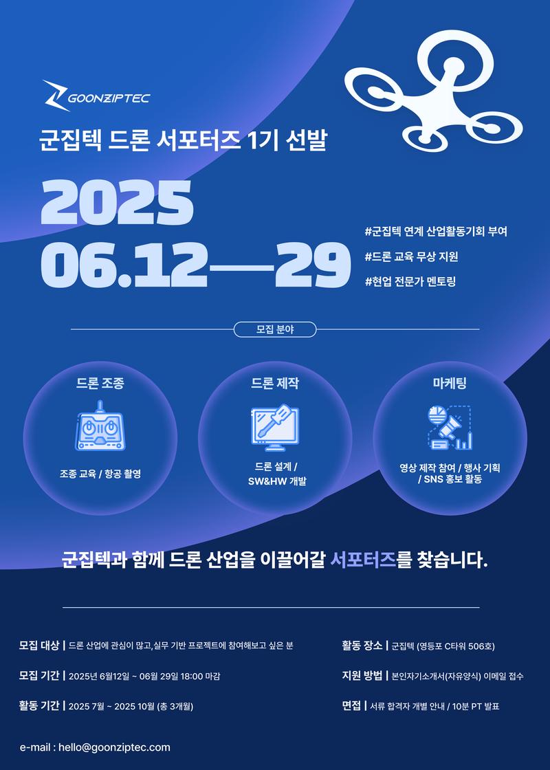 지원조건 : 드론을 좋아하고 군집텍 문화를 함께 만들어 갈수 있는 사람