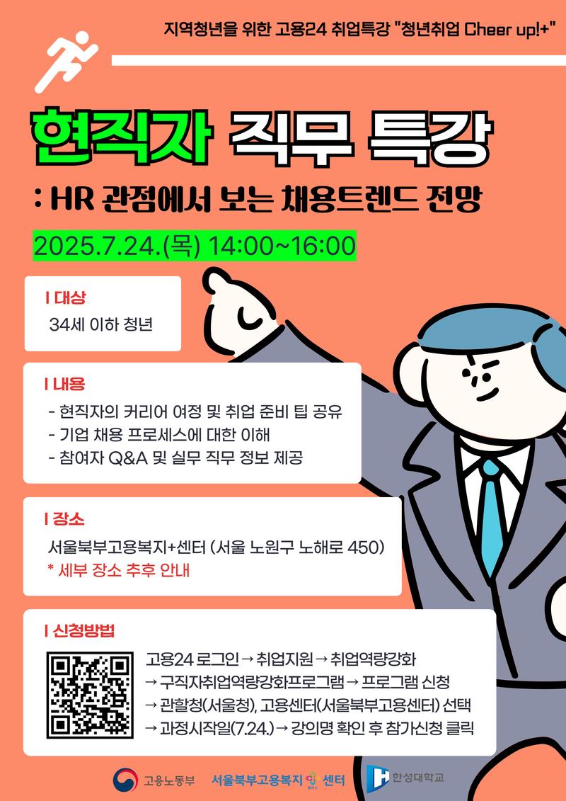 ✅ 주제: 현직자 직무 특강: HR 관점에서 보는 채용트렌드 전망 ✅ 일시: '25.7.24.(목) 14:00~16:00 ✅ 대상: 34세 이하 청년 ✅ 내용 - 현직자의 커리어 여정 및 취업 준비 팁 공유 - 기업 채용 프로세스에 대한 이해 - 참여자 Q&A 및 실무 직무 정보 제공 ✅ 장소: 서울북부고용복지+센터(서울 노원구 노해로 450) * 세부 장소는 추후 문자 등으로 안내 ✅ 신청: 고용24 바로가기 클릭 고용24 로그인(work24.go.kr) → 취업지원 → 취업역량강화 → 구직자취업역량강화 프로그램 → 프로그램 신청의 일정보기 탭 → 관할청(서울청) 선택 → 고용센터 (서울북부고용센터) 선택 → 과정 시작일(7.24.), 신청접수상태(접수중) → 프로그램 (취업특강) 선택 → 검색 → 특강 과정명 확인 → 참가신청 | ||||