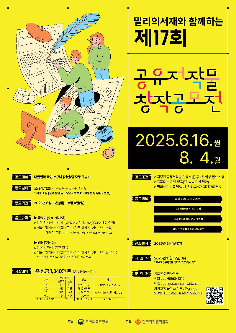 - 응모작 및 수상작은 공유마당 및 밀리의서재 누리집을 통해 공개 및 전시될 수 있으며, 주관기관은 수상작에 한하여 공유저작물 이용활성화를 위해 교육·홍보·전시 등의 목적으로 활용할 수 있음