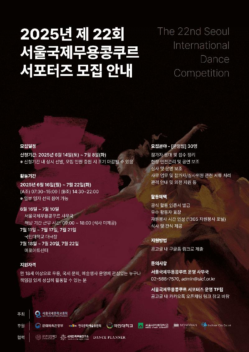 아시아 최대 국제 무용 콩쿠르 제 22회 서울국제무용콩쿠르의 서포터즈를 모집합니다. 전 세계 10개국 1,167명의 무용수가 참여한 제 22회 서울국제무용콩쿠르는 마린스키발레단의 김기민, 영국국립발레단의 이상은 등 세계 정상급 무용수를 배출해오고 있습니다. 올해는 국민대 대극장과 마포아트센터 아트홀맥에서 본선 및 서울국제무용콩쿠르 갈라 공연이 펼쳐집니다.
