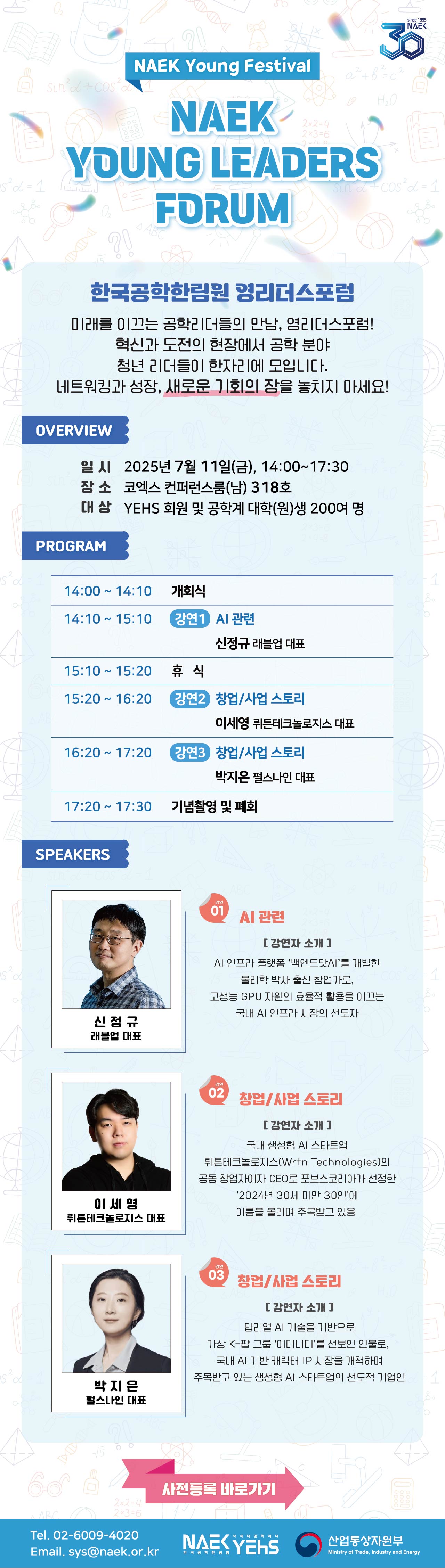 한국공학한림원(NAEK) 창립 30주년을 맞아 ‘미래 공학 인재들을 위한 참여형 교육과 공감의 장을 마련’ 하고자 차세대공학리더(YEHS)에서 주최하는 포럼입니다.