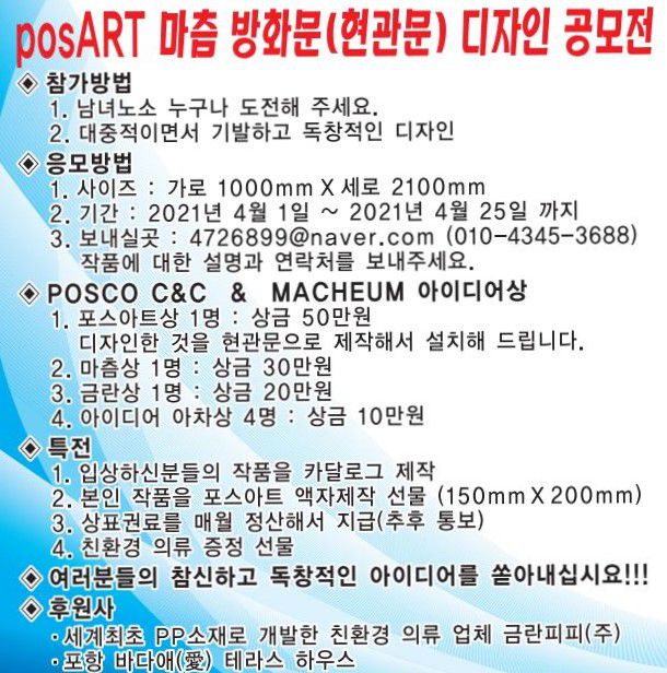 시상내용 : 포스아트상(대상) 상금 50만원 1명(팀), 마츰상(최우수상) 상금 30만원 1명(팀),