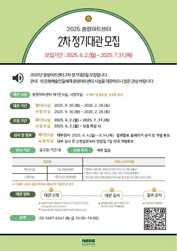 - 제1전시실: 내부심사 2025년 8월 4일(월) ~ 2025년 8월 14일(목) / 결과발표 홈페이지 공지 및 개별 통보