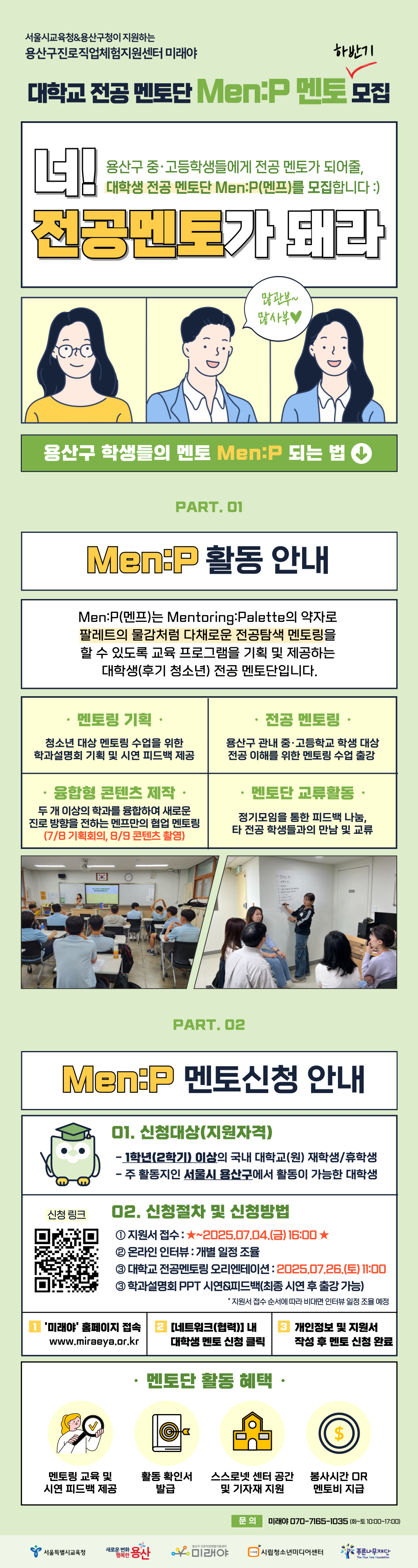 용산구 중·고등학생의 전공 멘토로서 <대학교 전공멘토링> 활동을 통해 청소년들과 더불어 성장해 갈 진정성 있는 멘토를 모집하오니 많은 지원바랍니다!
