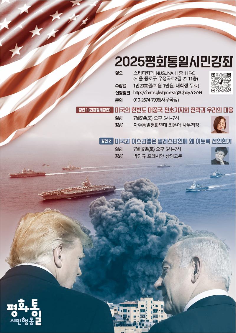 한반도를 둘러싼 미국의 군사전략을 살펴보고 국제사회의 비판에도 불구하고 2년째 팔레스타인에서 전쟁을 이어가고 있는 미국과 이스라엘의 의도를 살펴보는 알찬 강연을 준비했습니다. 여러분들의 많은 참여 바랍니다!