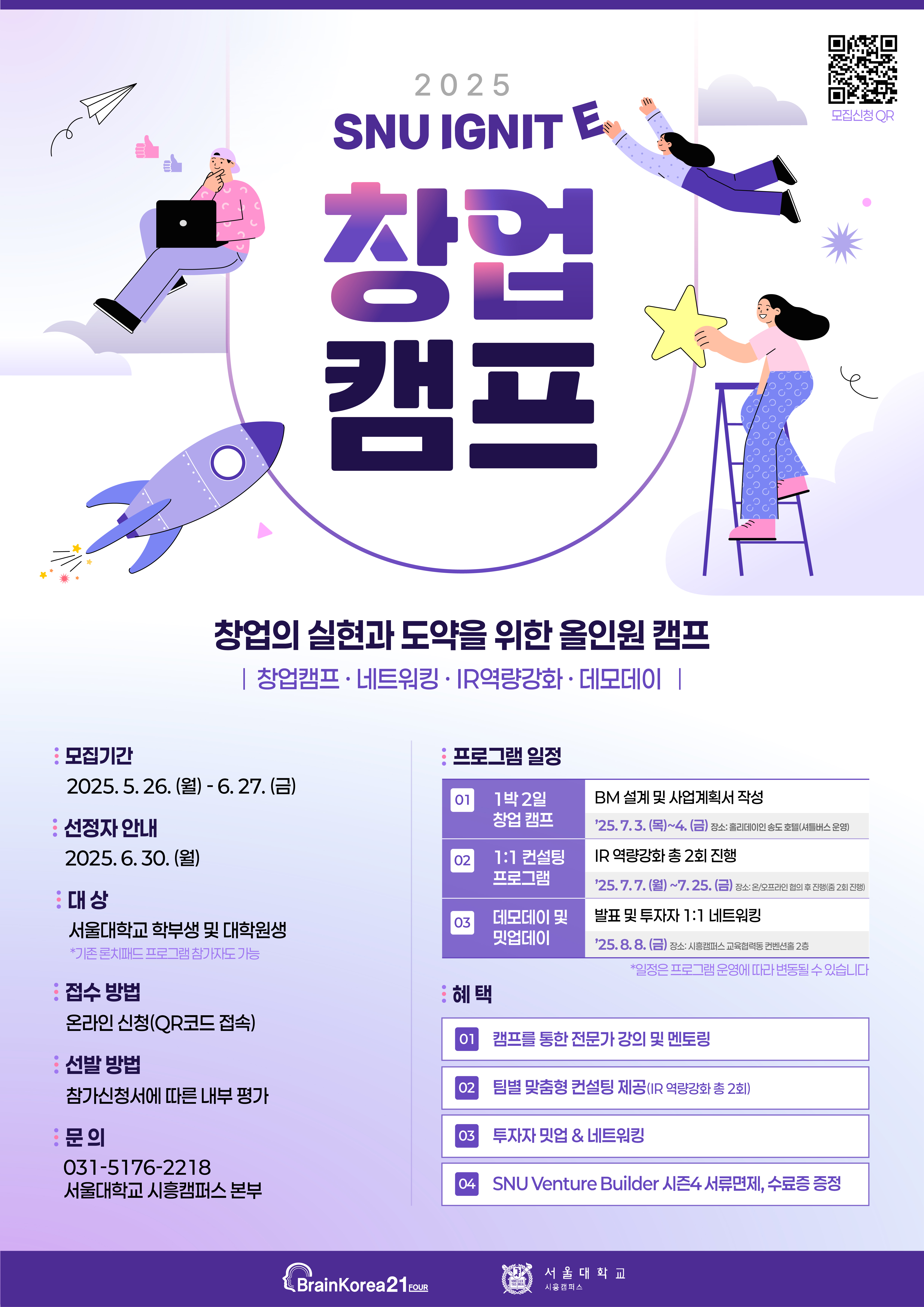 그 중 2025 SNU IGNITE 창업 캠프는 아이디어를 가진 예비 · 초기 창업자의 역량 강화를 위한 올인원 프로그램으로 아이디어가 명확하지 않아도 신청 가능하며 개인으로, 팀으로도 참여가능합니다!