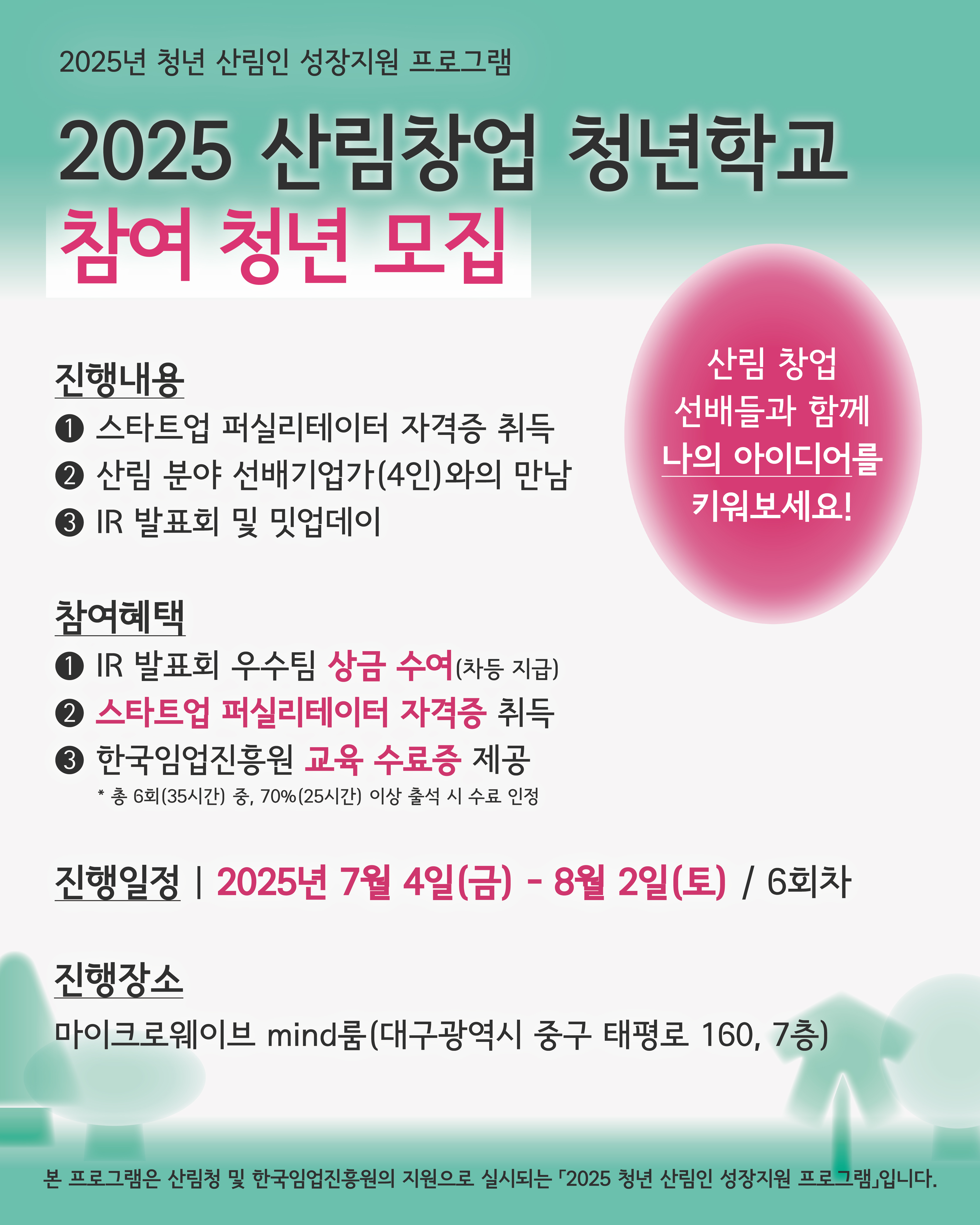 창업을 꿈꾸는 청년 중 🌲산림분야 미래가치에 관심있는 분들의 많은 참여 바랍니다!😀