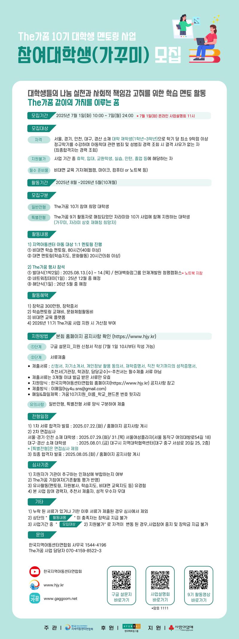 2단계 | 지원서 e-mail제출 (hjy4u.sns@gmail.com) 필수 제출 : 신청서, 자기소개서, 개인정보 활용동의서, 재학증명서, 직전학기까지의 성적증명서 ※재학증명서 및 성적증명서는 3개월 이내 발급받은 서류만 가능 ※일반전형, 특별전형 서류 구분하여 제출 / 특별전형 대상자는 아래 심사기준에서 확인 선택 제출 : 교수 및 기관 추천서 메일&파일제목 : 가꿈10기지원_이름_학교_핸드폰번호 뒷자리 (ex.가꿈10기지원_한지연_한국대학교_1234) | ||