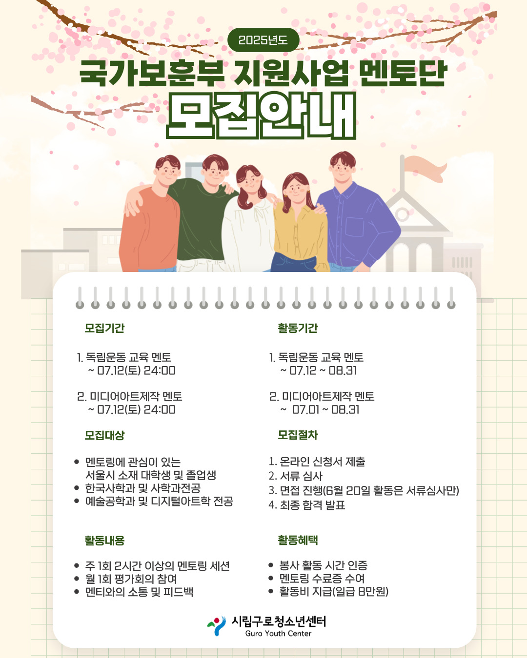 - 2025년 국가보훈부 보훈해봄지원사업 '빛으로 그리는 독립의 길' 독립운동교육 / 미디어아트제작 멘토를 모집합니다.