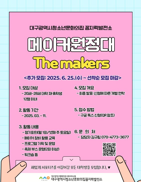 메이커 장비를 배우고, 예비 청소년지도사로서 다양한 경험을 쌓고 싶은 대학생 여러분의 많은 관심과 참여를 기다립니다🩷