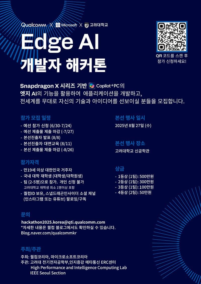 퀄컴에서 마이크로소프트 코리아, 고려대학교와 함께 Edge AI 개발자 해커톤을 개최합니다. 참가자들은 Snapdragon® X 시리즈 기반 Copilot+ PC에서 실행되는 엣지 AI 애플리케이션을 개발하며, 글로벌 무대에서 자신의 기술력을 자랑할 수 있습니다.
