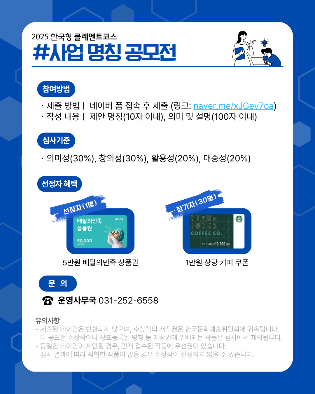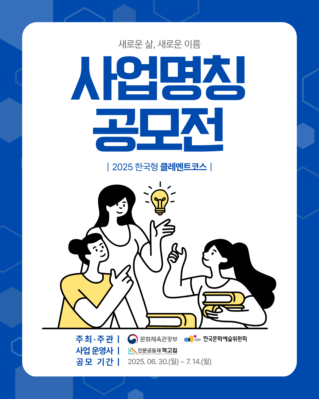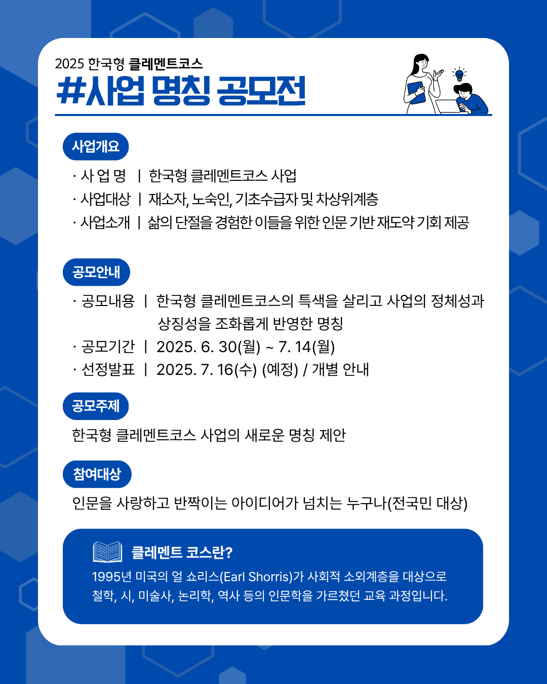 2025년 한국형 클레멘트 코스 사업의 새로운 이름을 지어주세요! 한국형 클레멘트 코스는 삶의 단절을 경험한 이들을 위해 인문 기반 재도약 기회를 제공하고자 하는 목적을 지닌 사업입니다.