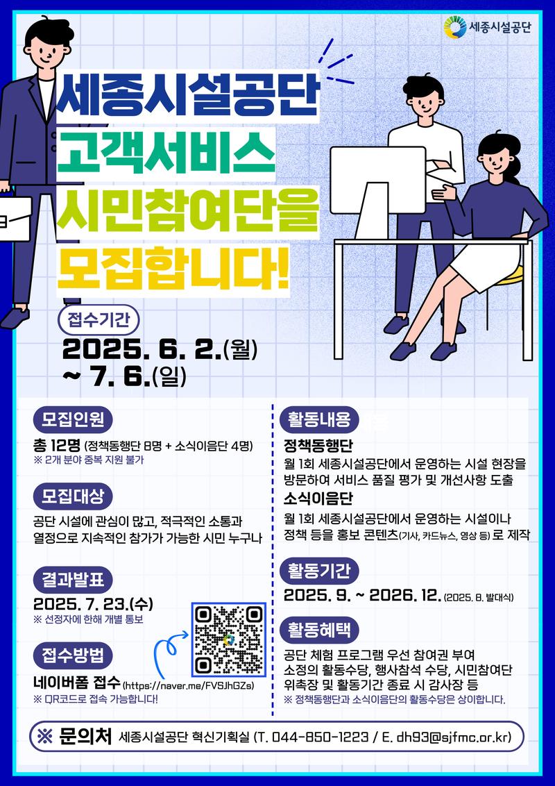 세종시설공단에서는 고객의 다양한 의견을 수렴하고 이를 경영에 반영함으로써 고품질 고객서비스를 제공하고자 다음과 같이 공공서비스 시민참여단을 모집합니다.