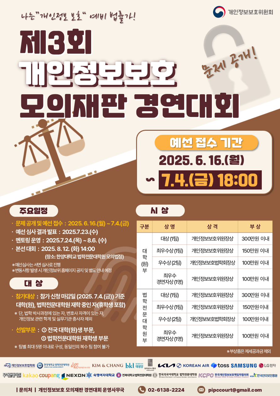 📍문의처: 개인정보보호 모의재판 경연대회 운영사무국 (02-6138-2224, pipccourt@gmail.com, @pipccourt)
