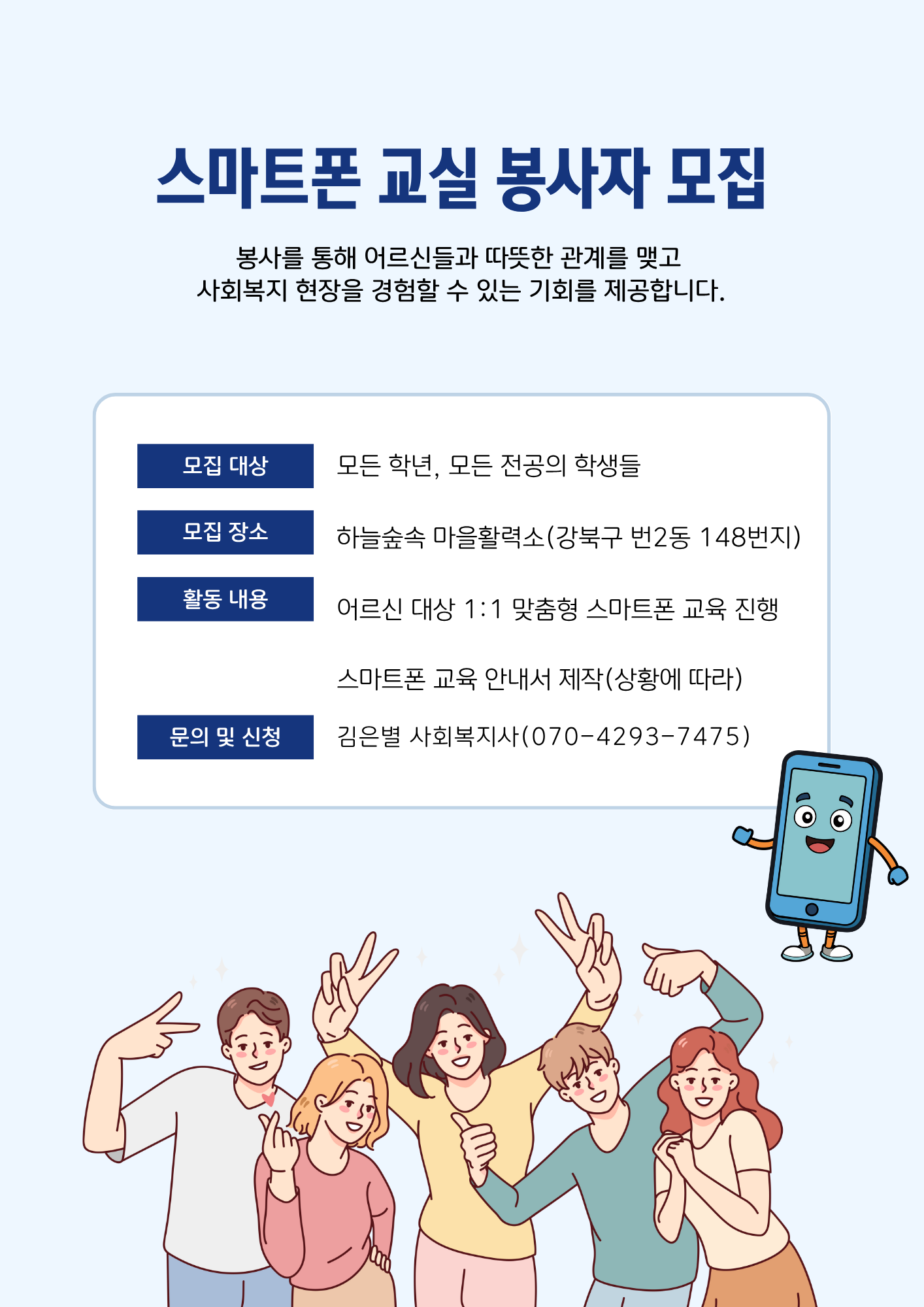 스마트폰을 알려줄 순 없지만 배우러 오시는 어르신들을 안내하고 홍보하고 모집합니다.