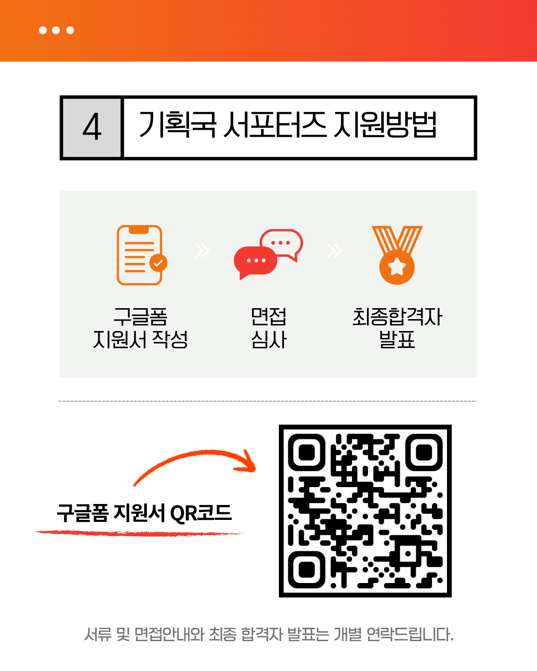 맨 아래에는 “서류 및 면접안내와 최종 합격자 발표는 개별 연락드립니다.”라는 문장이 적혀 있다.