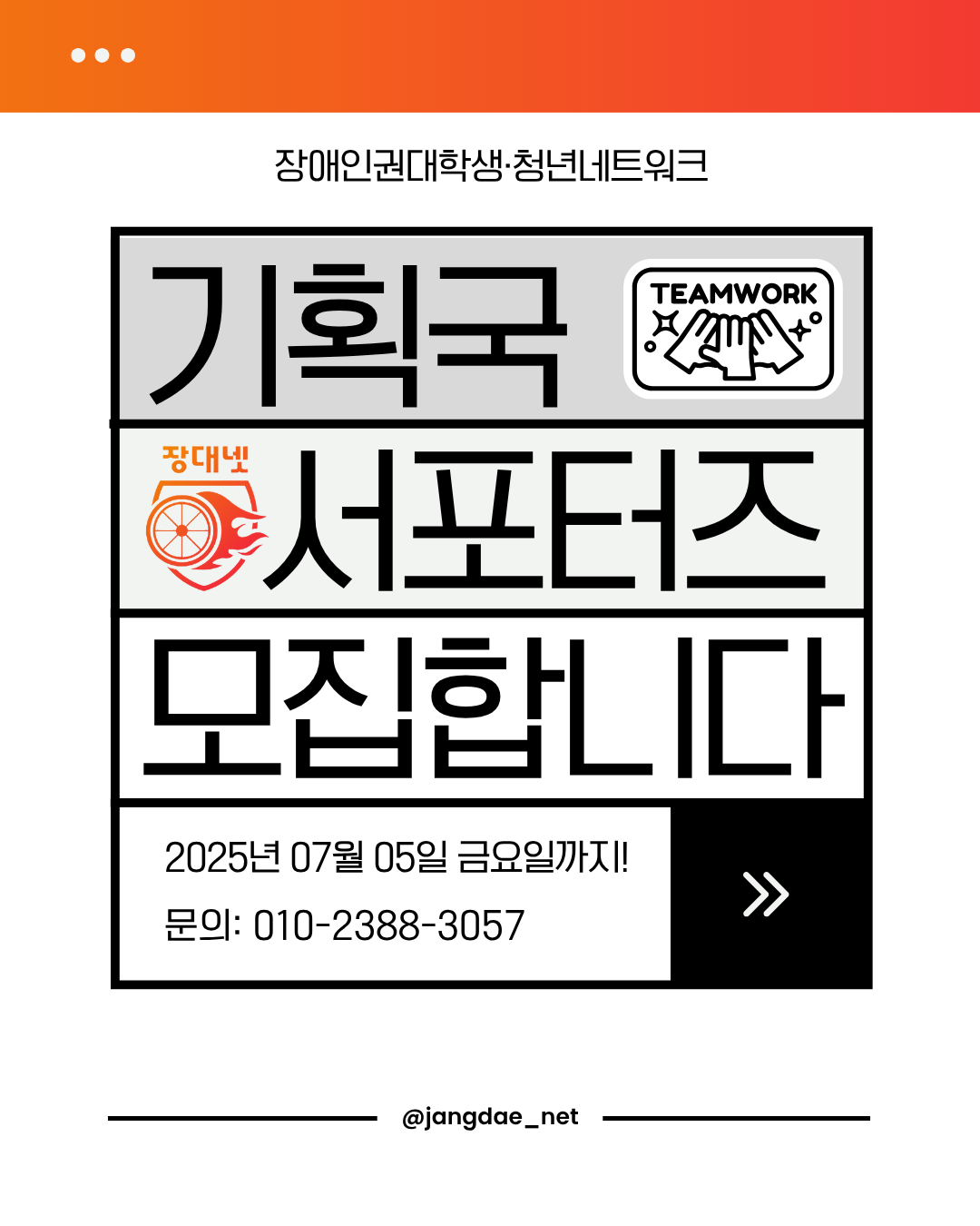 그 아래 큼직한 검정 글씨로 ‘기획국 서포터즈 모집합니다’라는 문구가 회색 배경 네모칸 안에 나눠서 배치되어 있으며, 오른쪽 상단에는 손을 모은 ‘TEAMWORK’ 일러스트 아이콘, 왼쪽 중단에는 휠체어 바퀴에 불꽃이 달린 장대넷 로고가 배치되어 있다.