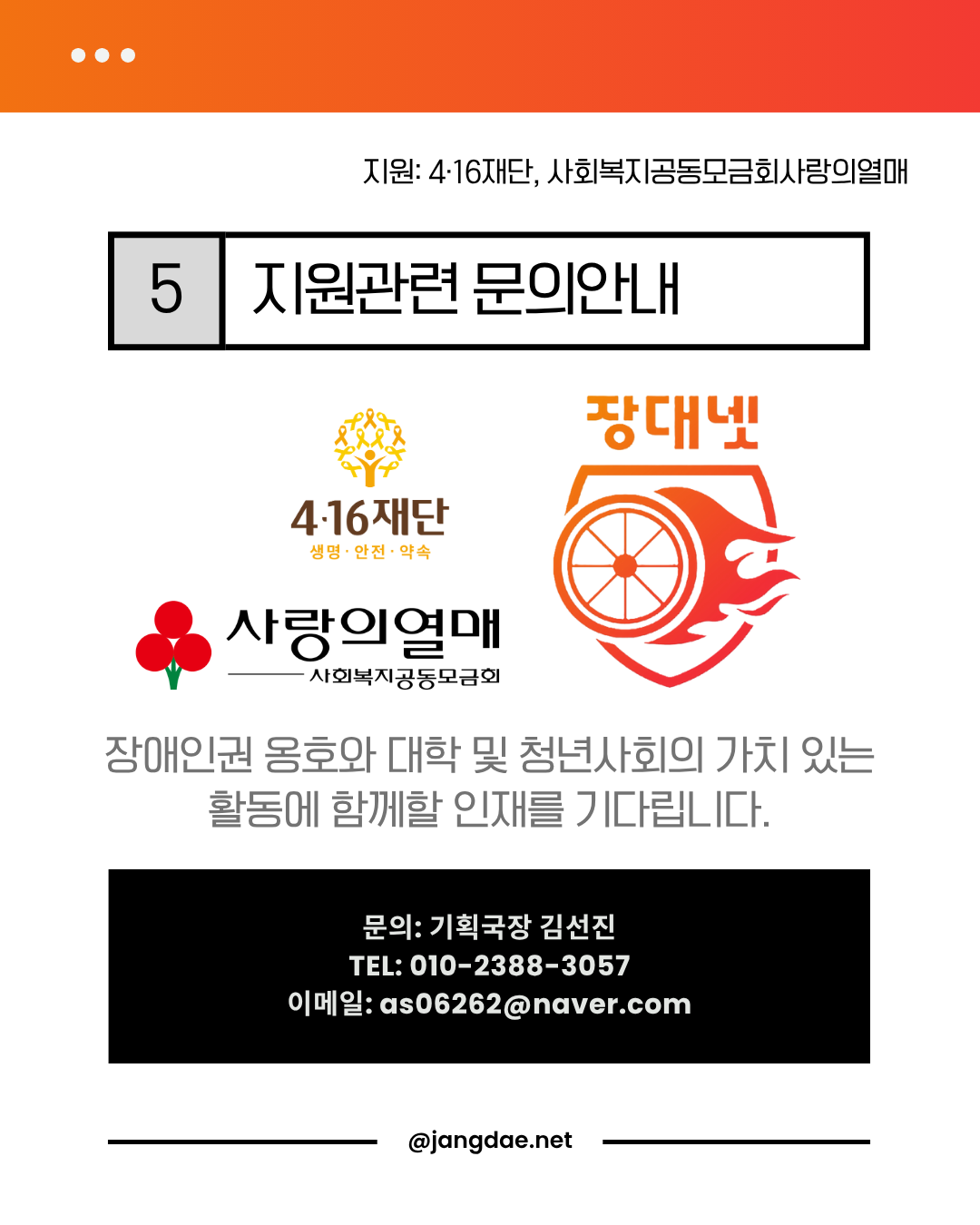 상단 주황색 배경 아래에 “지원: 4·16재단, 사회복지공동모금회사랑의열매”라는 안내 문구가 적혀 있다.