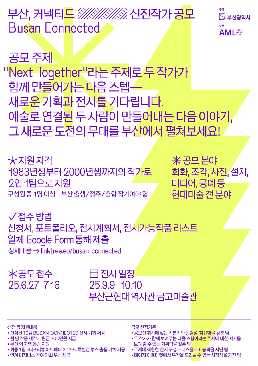 예술로 연결된 두 사람이 만들어내는 다음 이야기, 그 새로운 도전의 무대를 부산에서 펼쳐보세요! 부산시가 지역 미술시장 발전과 탄탄한 미술생태계 구축을 위해 신진작가를 지원합니다.