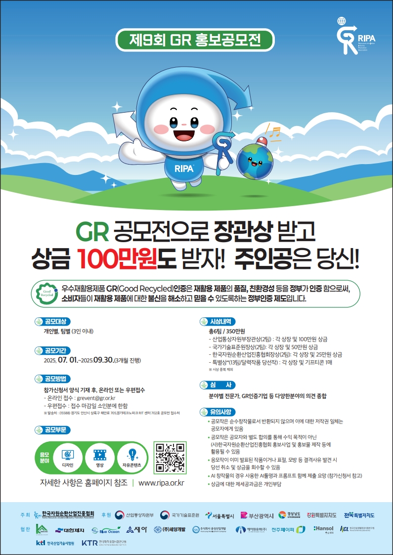 (사)한국자원순환산업진흥협회에서는 순환경제와 우수재활용제품(GR)에 대한 인식을 확산시키고자 「제9회 GR 홍보공모전」을 개최합니다.