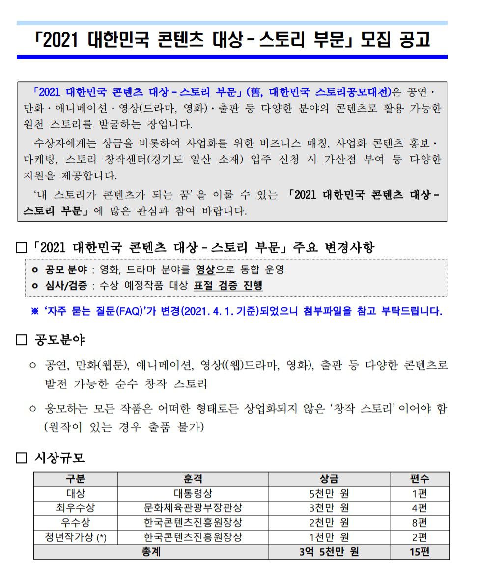 「2021 대한민국 콘텐츠 대상 - 스토리 부문」 모집 공고 (舊, 대한민국 스토리공모대전)