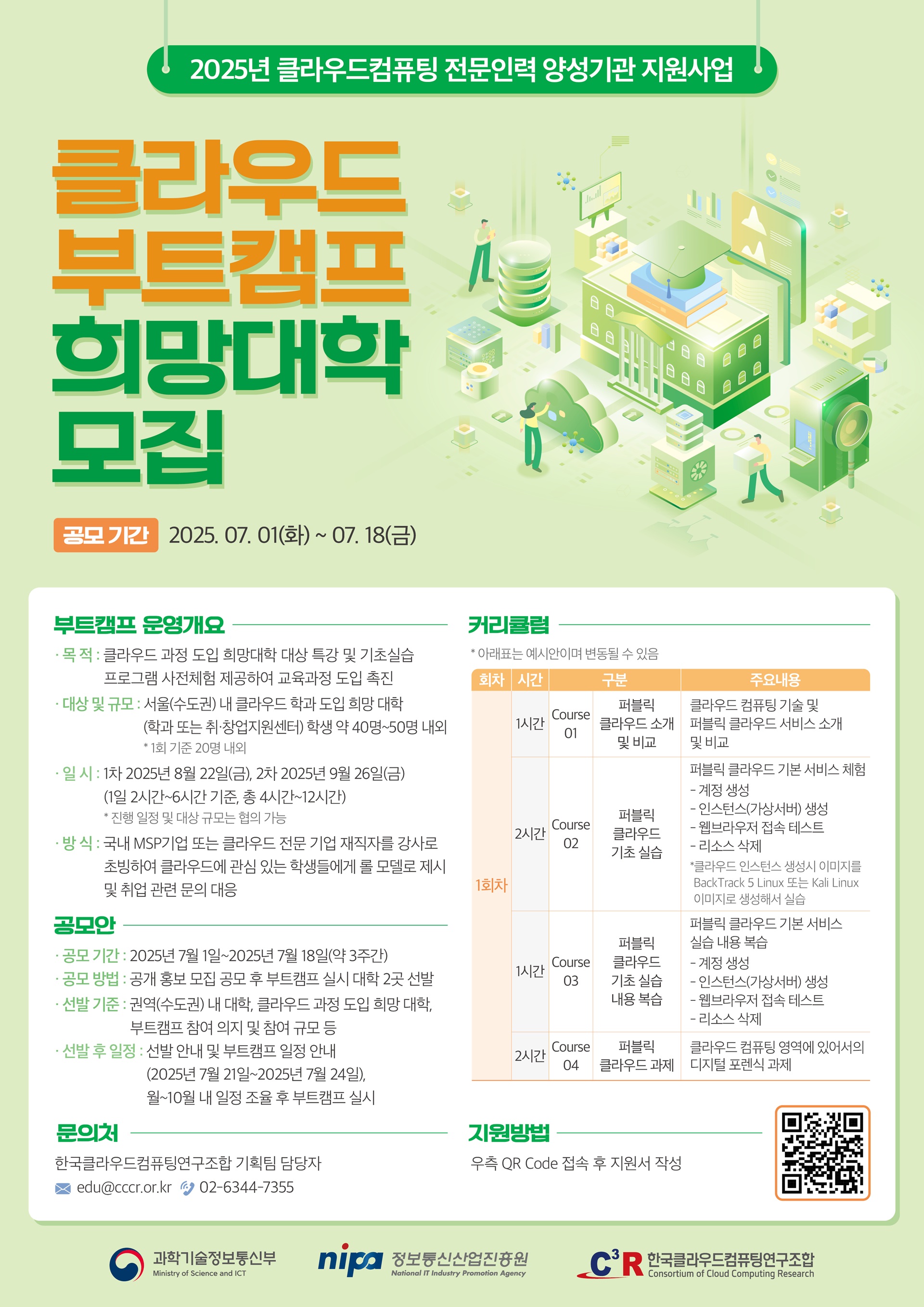 문의처 : 한국클라우드컴퓨팅연구조합 기획팀 담당자(02-6344-7355, edu@cccr.or.kr)