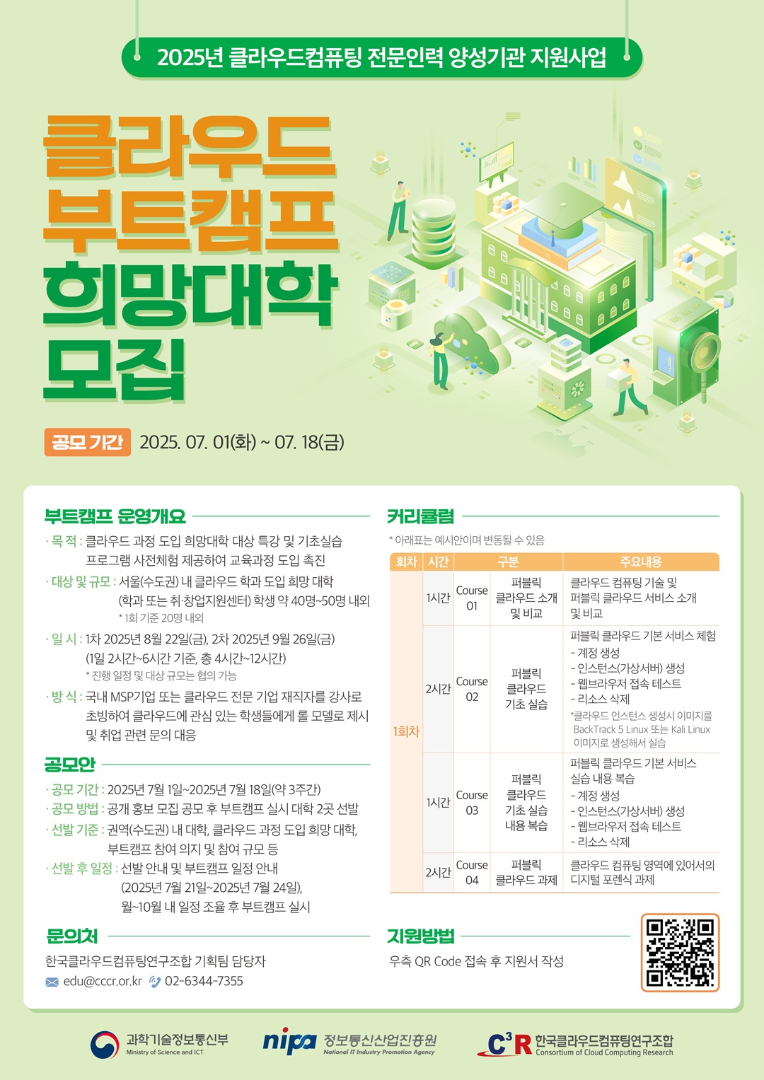 국내 제 1호 클라우드컴퓨팅 전문인력 양성기관 한국클라우드컴퓨팅연구조합에서 2025년 클라우드 부트캠프 참여 대학을 모집합니다.