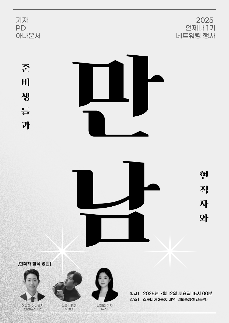 ์ ํฌ๋ ์ธ๋ก /๋ฏธ๋์ด ๋ถ์ผ์ ์ง์ ์ ์ค๋นํ๋ ๋ํ์๋ค์ด ๋ชจ์ฌ ์ ๋ณด๋ฅผ ๊ณต์ ํ๊ณ , ํจ๊ป ์ฑ์ฅํ๋ ํ๋์ ์ด์ด๊ฐ๊ณ ์์ต๋๋ค.