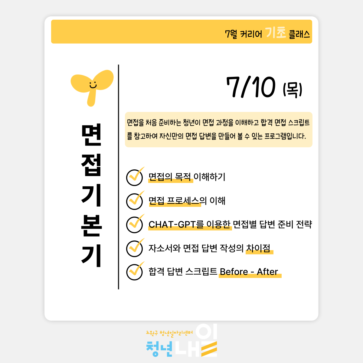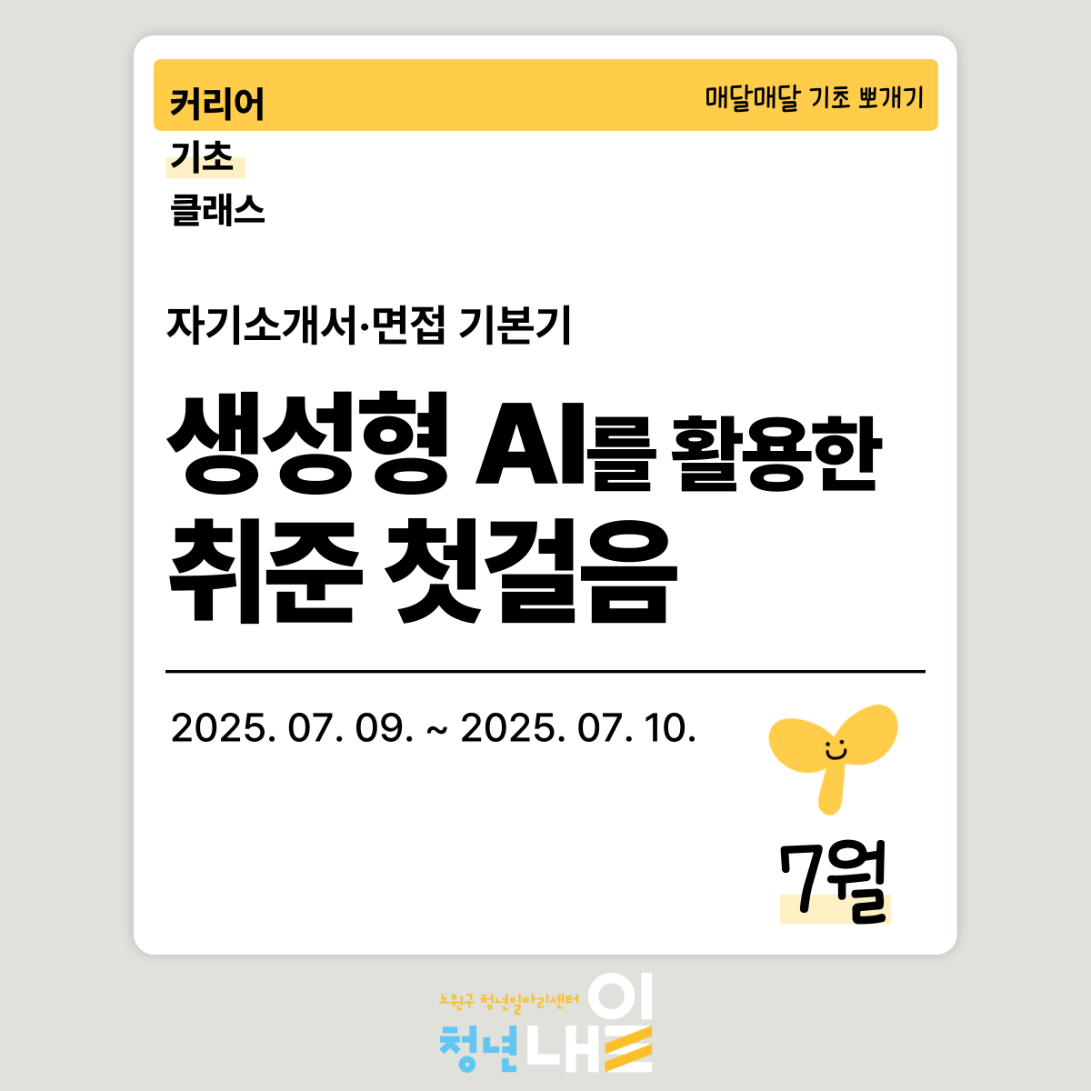 이번 노원일자리센터 청년내일에서 진행하는 7월 커리어 기초 클래스 <생성형 AI를 활용한 취준 첫걸음> 교육을 제가 진행하게 되어서 교육을 추천드립니다.