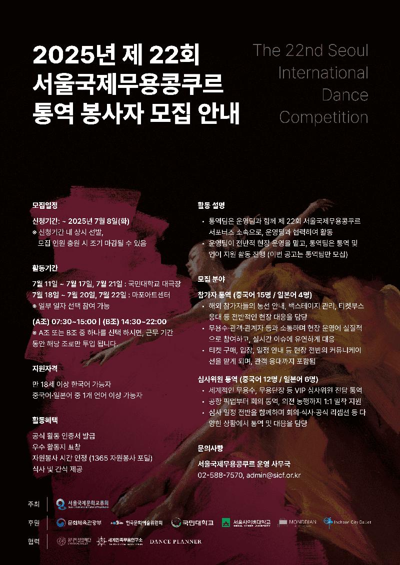 아시아 최대 국제 무용 콩쿠르 제 22회 서울국제무용콩쿠르의 통역 봉사자를 모집합니다. 전 세계 10개국 1,167명의 무용수가 참여한 제 22회 서울국제무용콩쿠르는 마린스키발레단의 김기민, 영국국립발레단의 이상은 등 세계 정상급 무용수를 배출해오고 있습니다. 올해는 국민대 대극장과 마포아트센터 아트홀맥에서 본선 및 서울국제무용콩쿠르 갈라 공연이 펼쳐집니다.