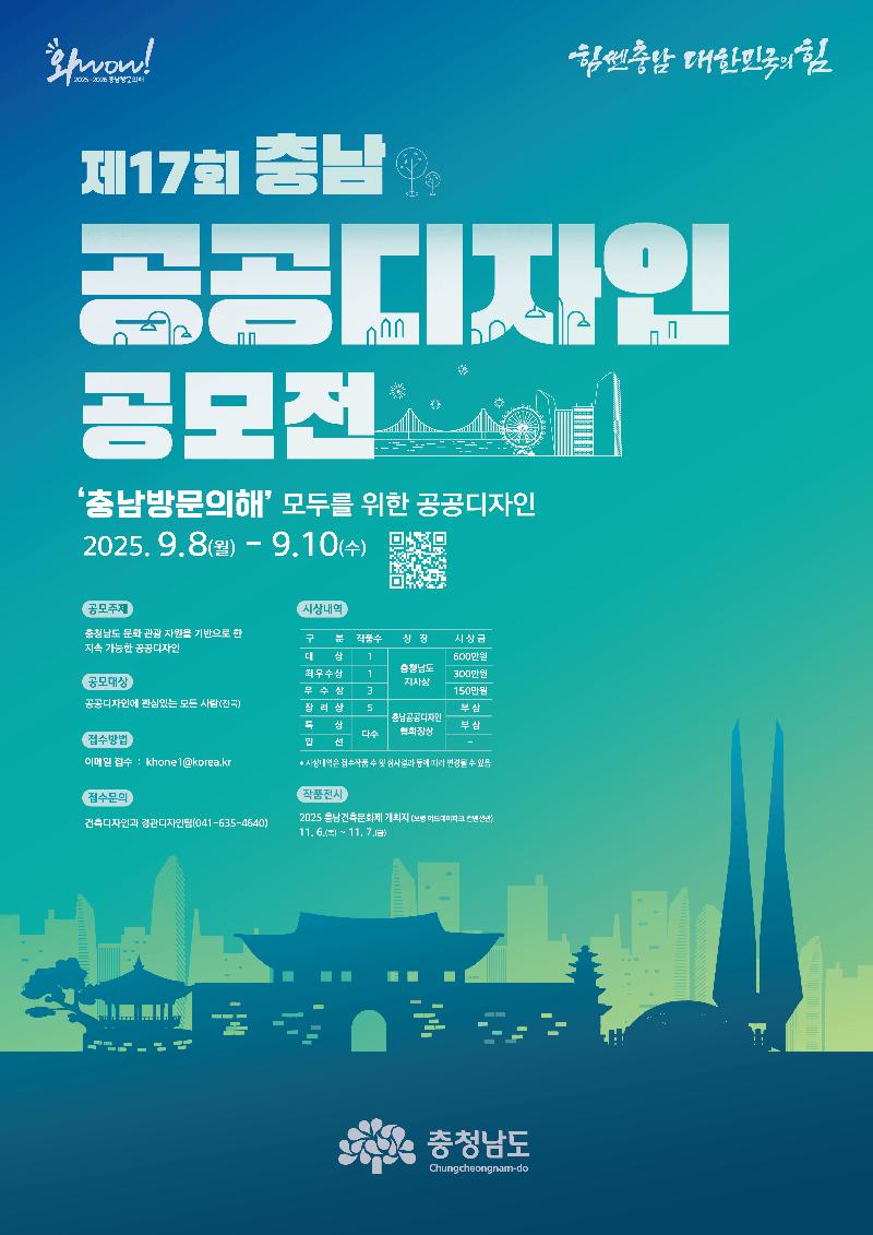 □ 신청방법 (공모신청 및 1차작품접수) ○ 이메일 접수: khone1@korea.kr ○ 공모신청 서류 : 참가신청서, 작품설명서, 서약서, 개인정보제공 동의서, 저작권이용허락동의서 - 작품파일(A1size, 세로형식, 해상도 300dpi pdf 또는 ai파일) * 작품설명서, 작품파일 내용에 신청자 관련정보(학교,이름등) 표기 금지 (1차심사 결과발표) ○ 결과발표 : 2025. 9. 24.(수) 10:00 ○ 발표방법 : 충남건축문화제홈페이지(www.cnadf.or.kr) 공지 |