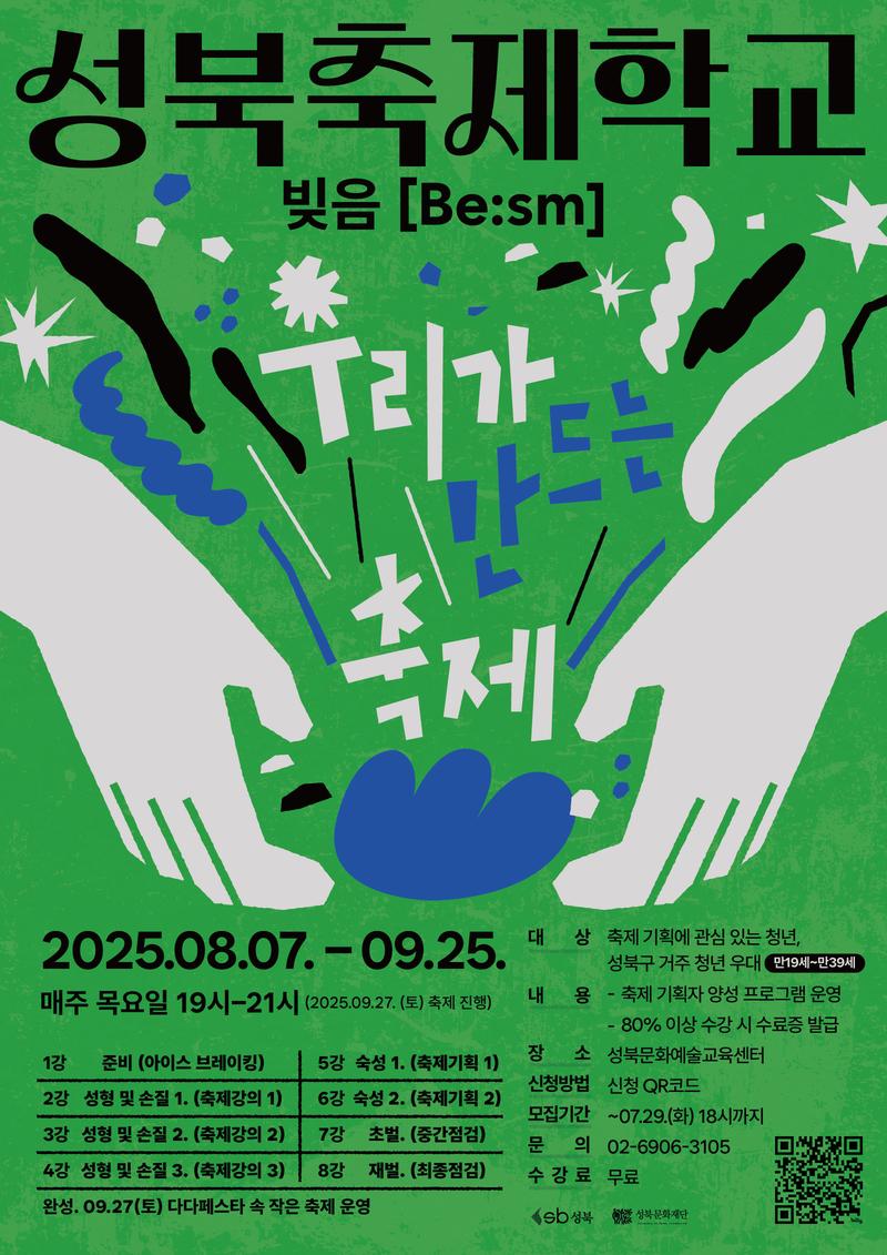 🎉 2025 성북축제학교 빚음 [Be:sm]은 축제의 기획과 실행의 전 과정을 ‘도자기를 빚는 과정’에 비유하여 정성과 열정으로 축제를 만들어가는 과정을 '빚음' 이라고 명칭하였습니다. 영문은 '존재하다' 의 (Be), ‘-주의' 의 (ism) 을 결합한 [Be:sm]을 부제로 단순히 무언가를 만들어내는 것에 그치지 않고, '축제의 정체성(존재)이 부여된 축제'를 만들어 가고자 하는 축제 기획자 양성 과정입니다. +++++++