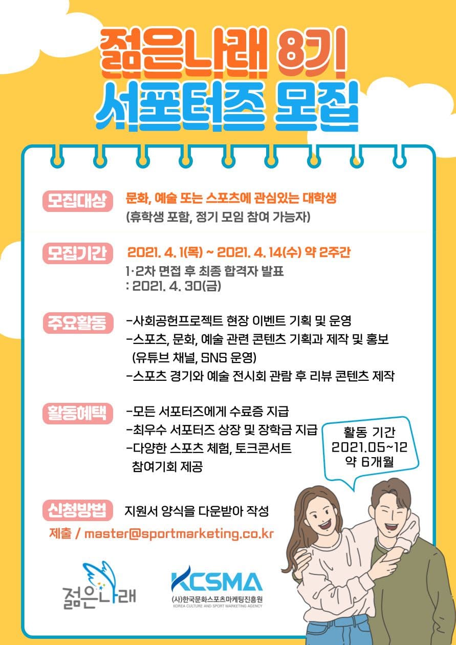 젊은이들의 꿈의 날개를 펼쳐나갈 서포터즈 '젊은나래' 8기를 모집합니다!