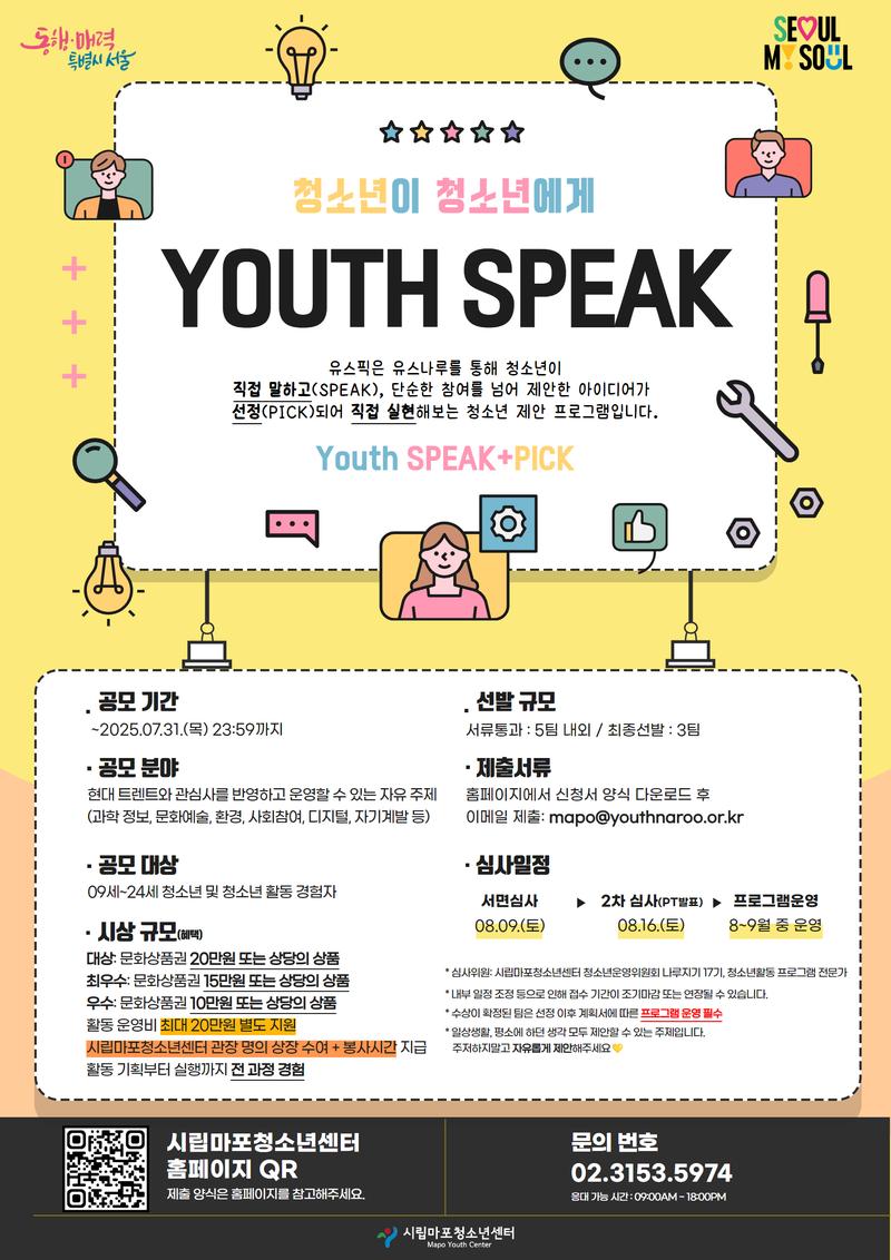 마포청소년센터에서는 청소년이 직접 제안하고 운영하는 프로그램, 유스픽 YOUTH+SPEAK 참가자를 모집합니다!