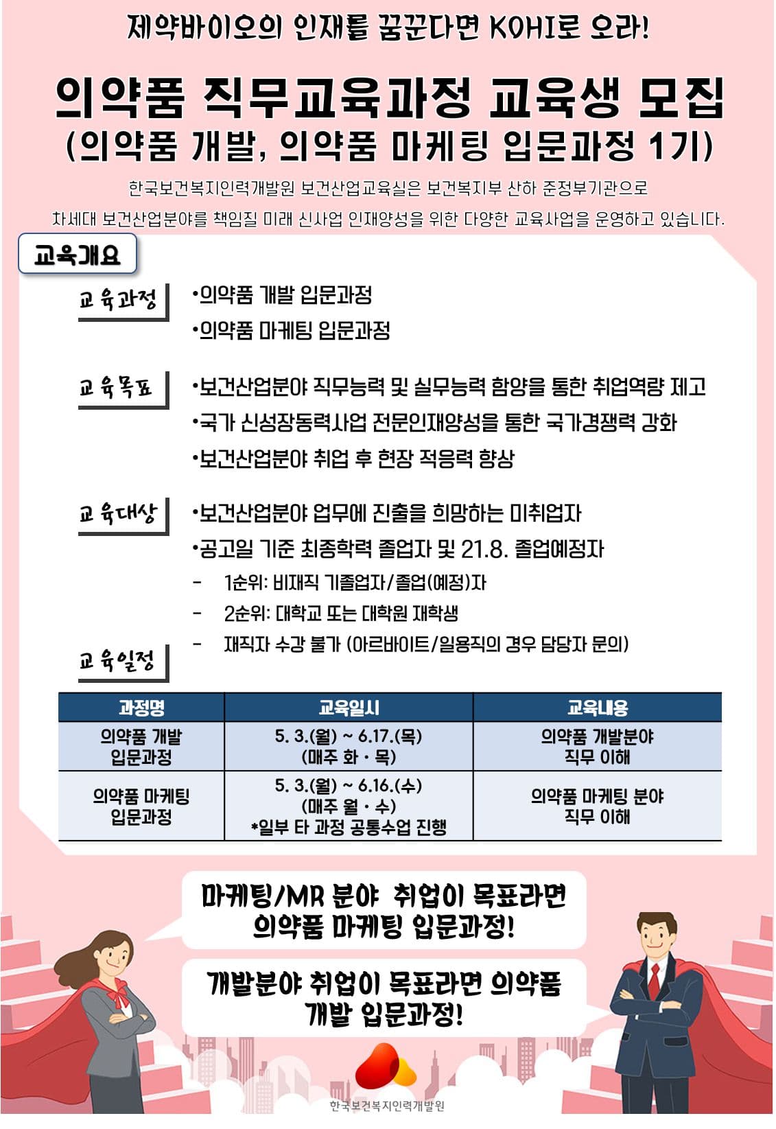 한국보건복지인력개발원에서 제약바이오산업 분야 취업준비생들을 위한 직무 교육과정 교육생을 모집합니다!