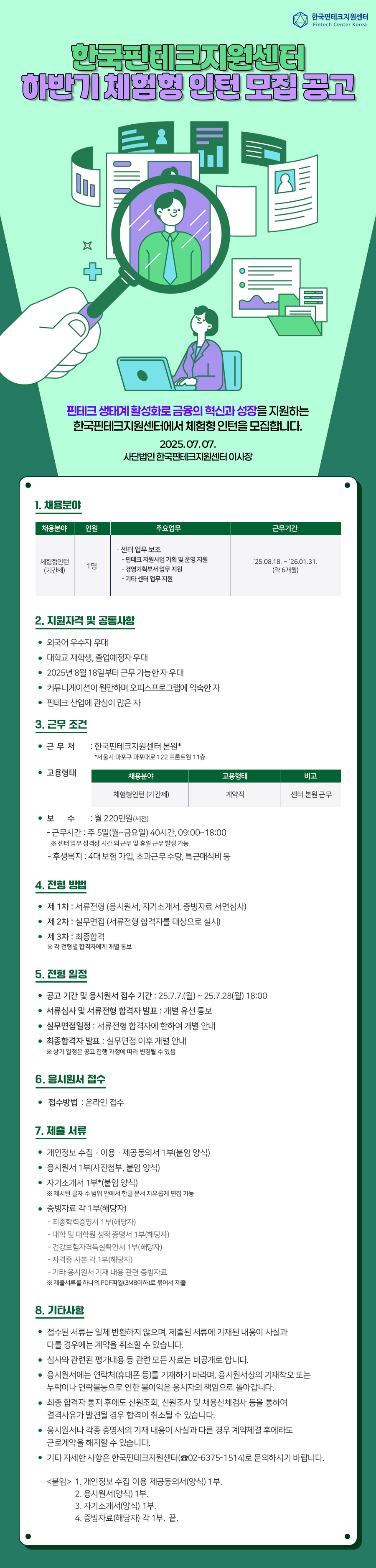 핀테크 생태계 활성화로 금융의 혁신과 성장을 지원하는 한국핀테크지원센터에서 체험형 인턴을 모집합니다.