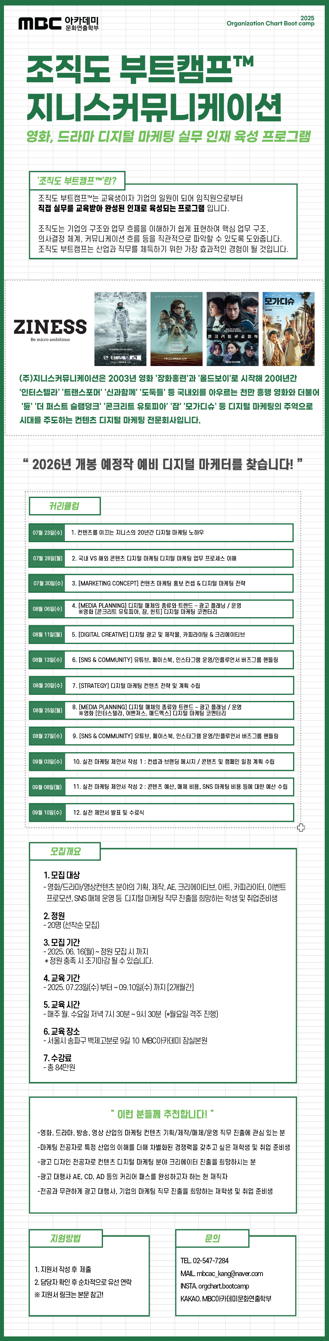 MBC아카데미가 다음과 같이 2025년 여름 조직도 부트캠프™ : 지니스커뮤니케이션 수강생을 모집합니다.