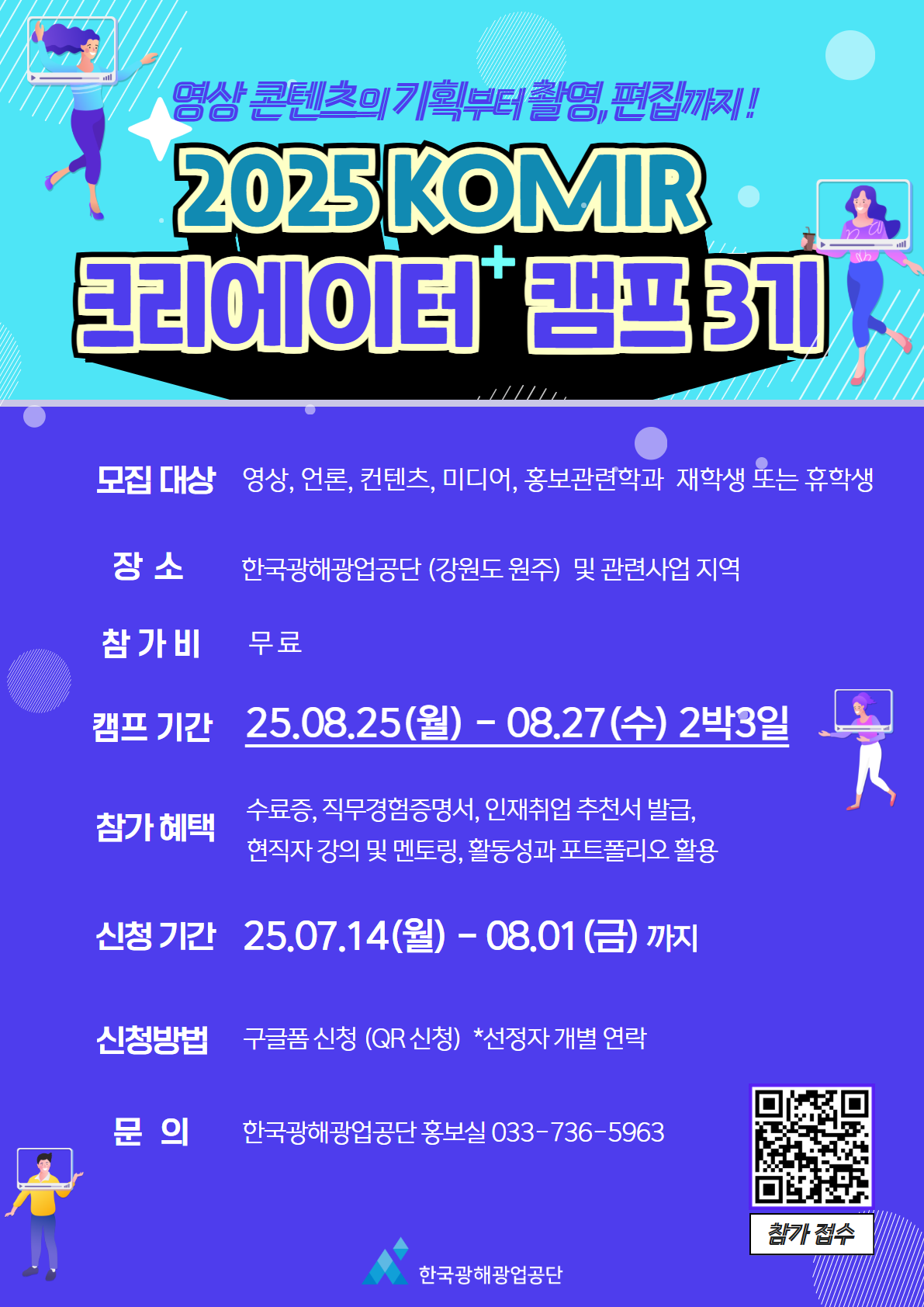 - KOMIR 크리에이터 캠프는 한국광해광업공단의 국민참여 콘텐츠 창출을 위해 진행하는 캠프로써
