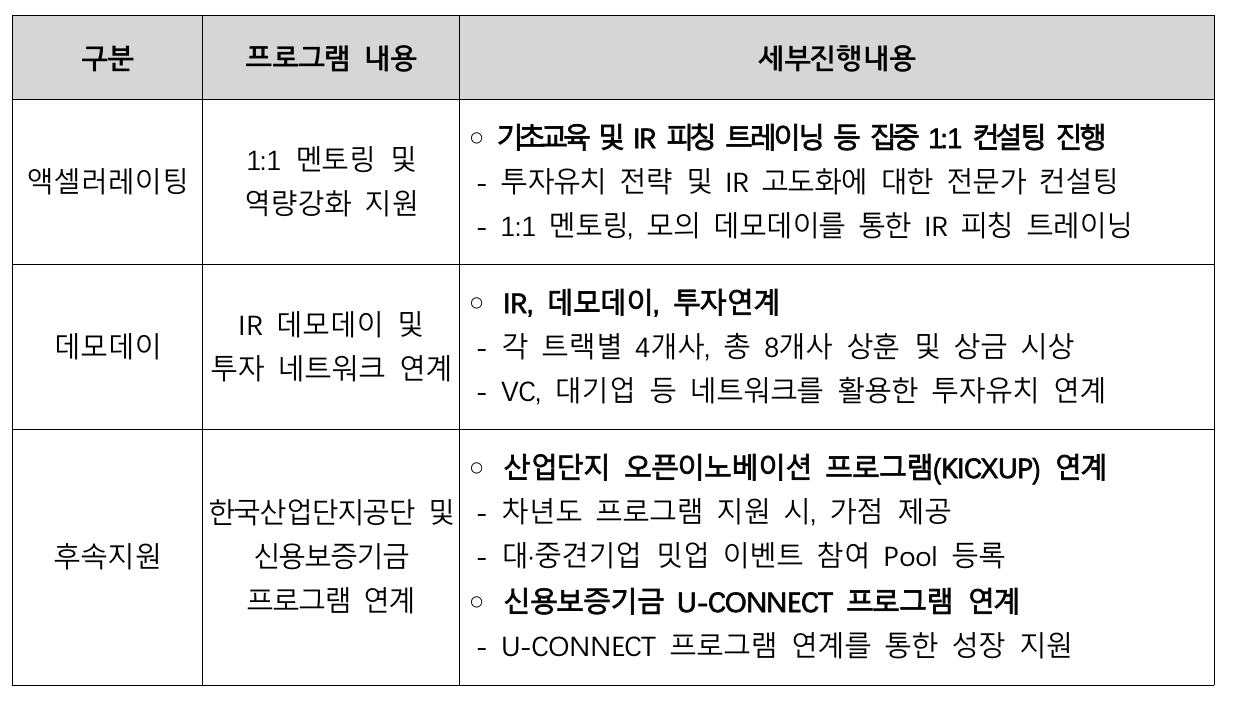 - 1:1 컨설팅 및 멘토링, IR 고도화 등 액셀러레이팅 프로그램 지원