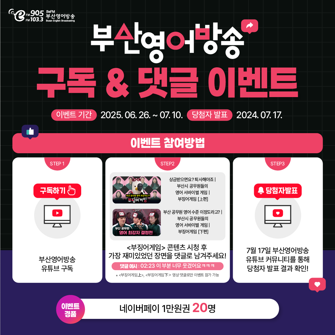 부산영어방송 유튜브 구독 & 댓글 이벤트!😍